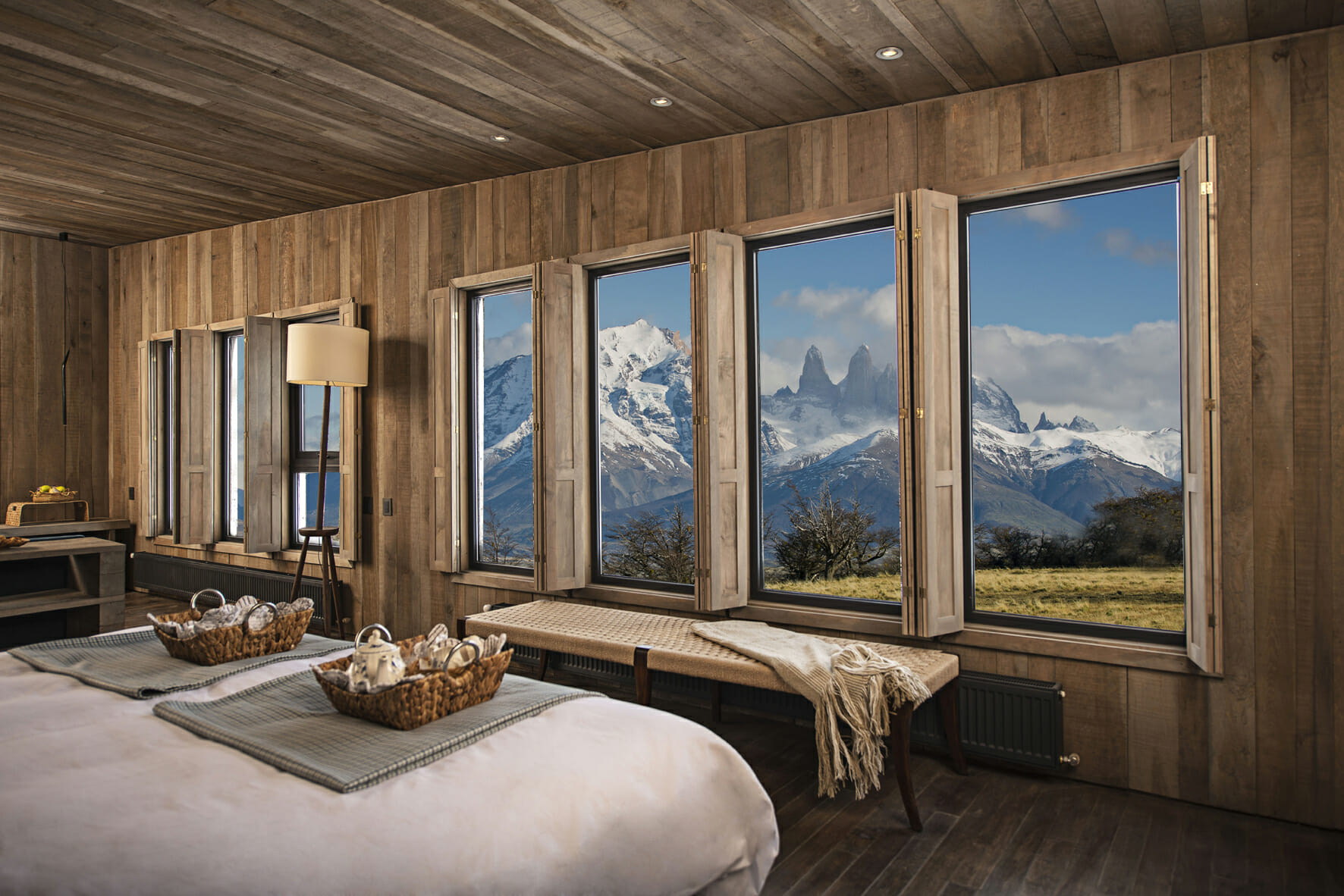 This Patagonia luxury lodge sits on the former campsite of Florence Dixie, a British adventurer who explored Patagonia’s peaks and pampas in the late 19th Century. It is now a 14,826-acre private reserve. The benefits to this location that were true back then still hold true today. Awasi is outside the park, nestled amongst a dense forest, offering refuge from Patagonia’s strong winds while enjoying breathtaking views of the Torres del Paine peaks and Lake Sarmiento.