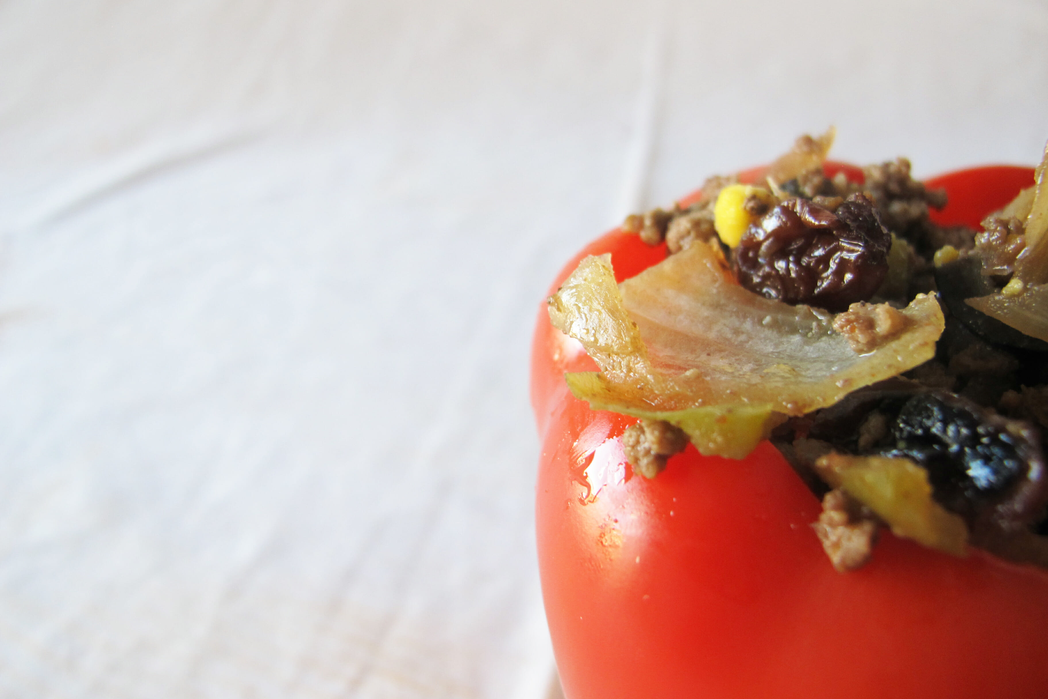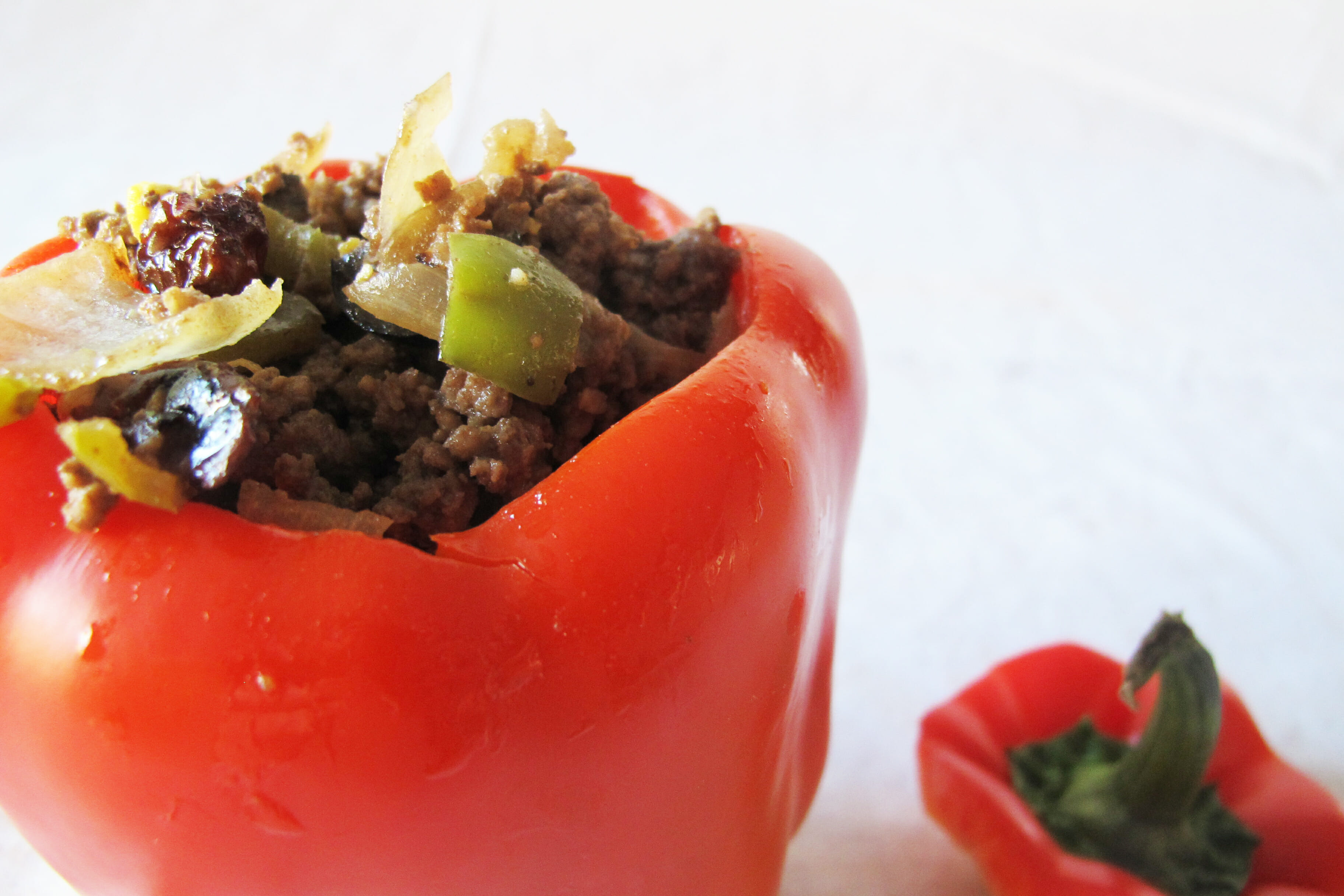 Preheat the oven to 350. Sauté garlic onions and chile peppers in one pan and mix in cumin and cayenne pepper. In a separate bowl pour boiling water over the raisins and let sit for roughly 10 minutes (or until they expand and soften). Add ground bison, raisins, black olives, and hard-boiled egg to your onion and chile pepper mixture. While browning the meat and vegetables, place the bell peppers in a pot of boiling water to soften. When ready, place the bell peppers on a baking sheet, fill with meat and vegetable mixture, and heat in oven for 10-15 minutes.